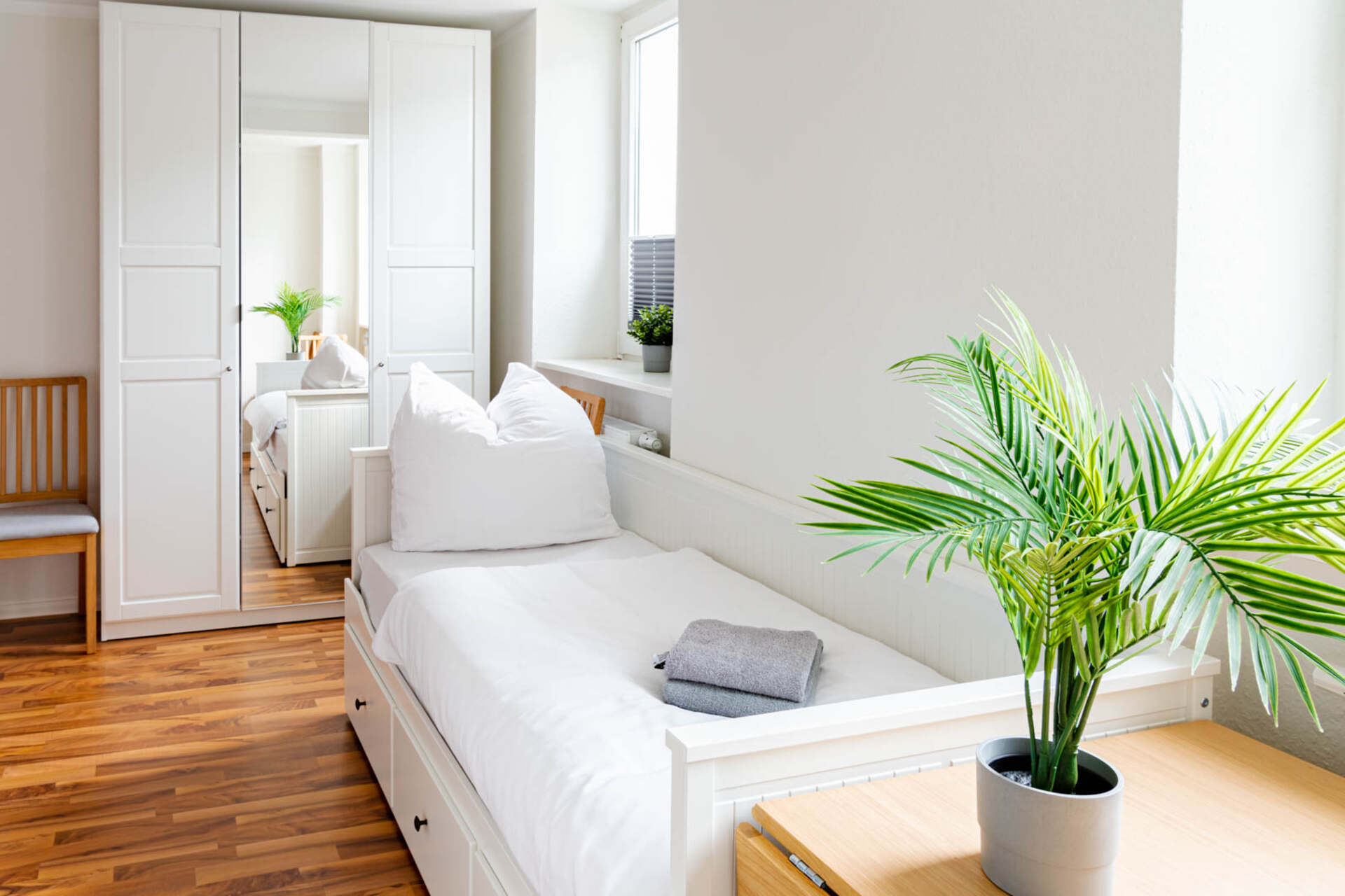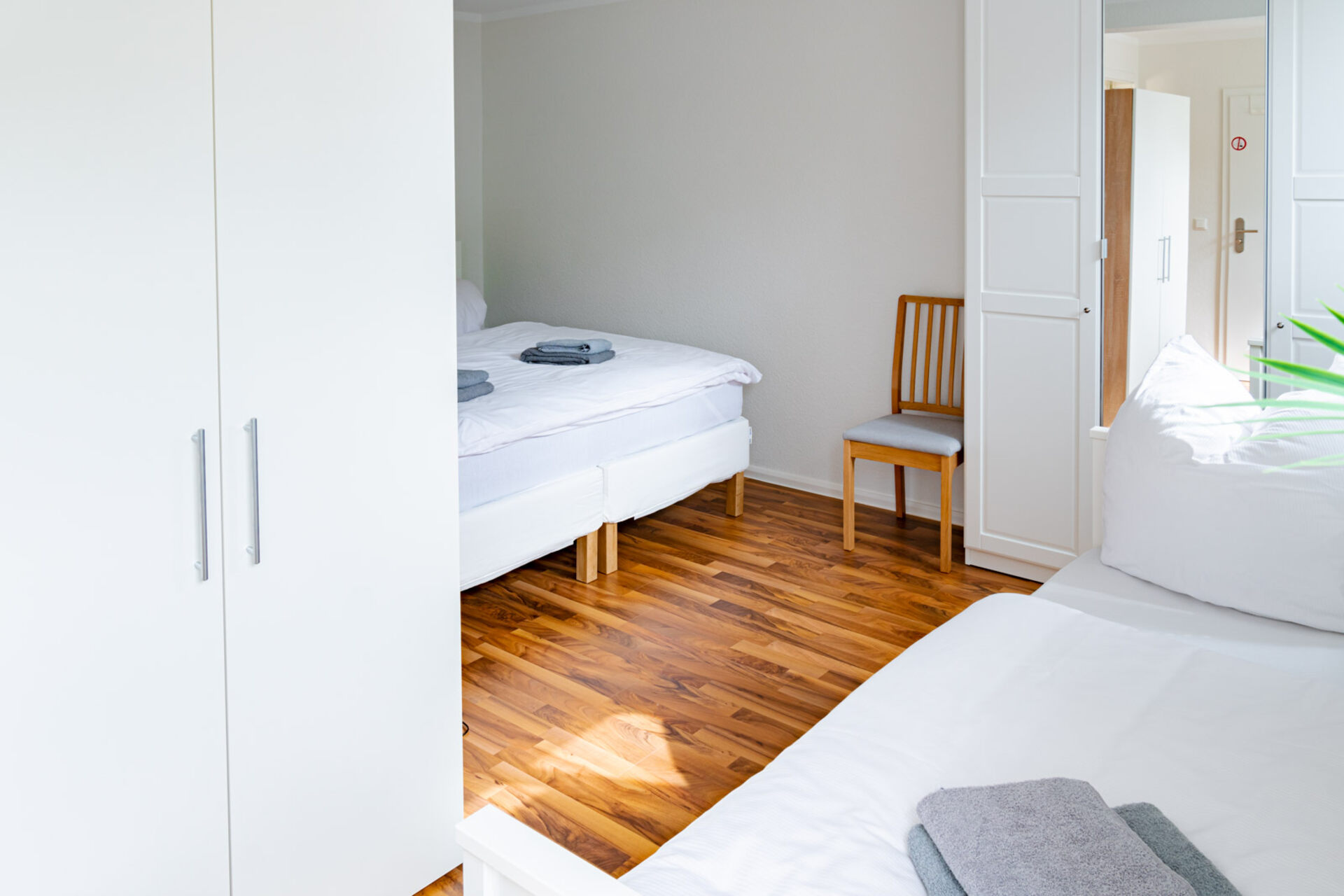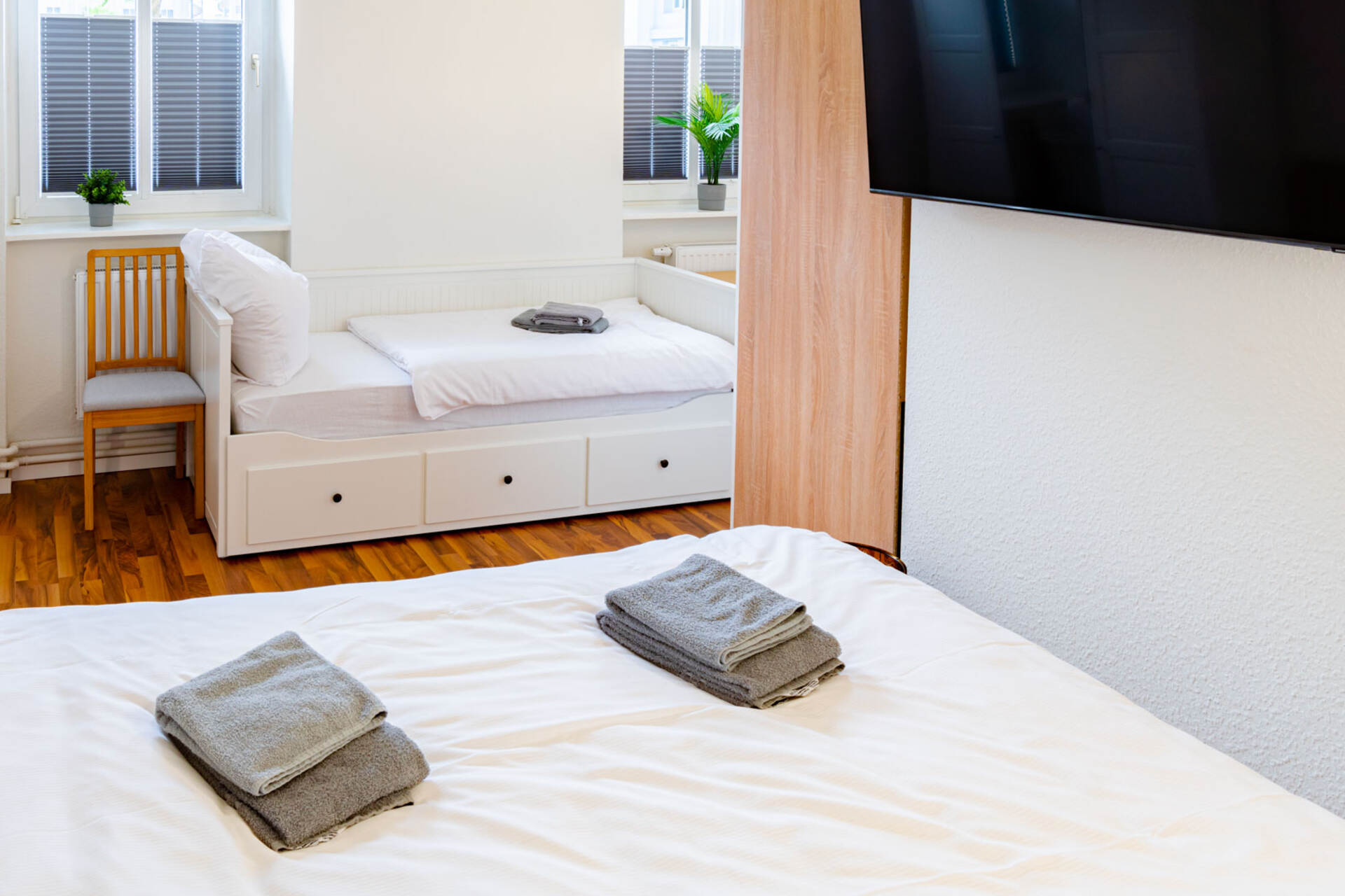 Das Apartment verfügt über ein komfortables Doppelbett sowie ein Einzelbett, sodass bis zu drei Gäste bequem übernachten können. Frische Bettwäsche und Handtücher sind selbstverständlich inklusive.