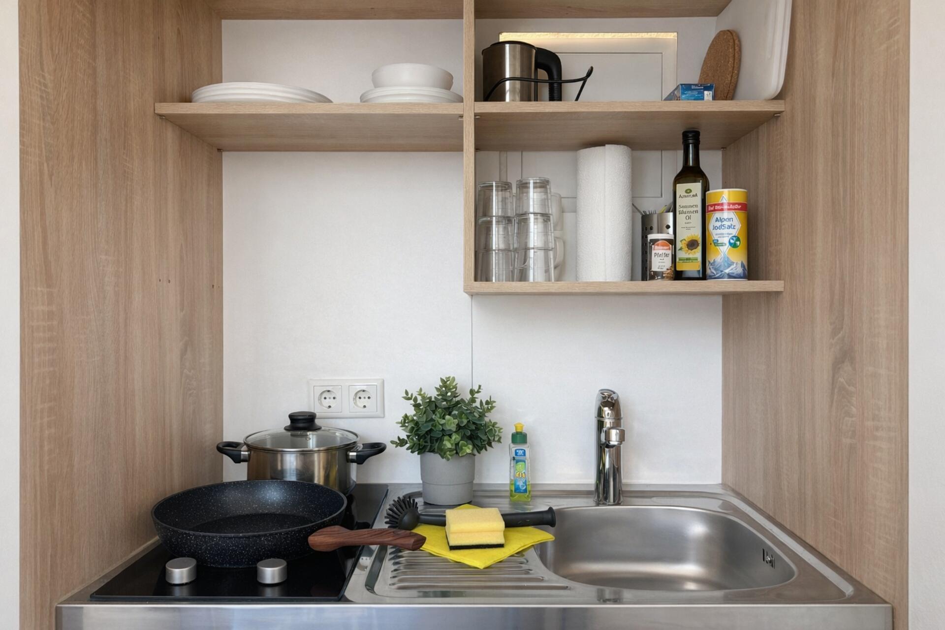 Die Küchenzeile bietet alles, was du für kleine Mahlzeiten brauchst: