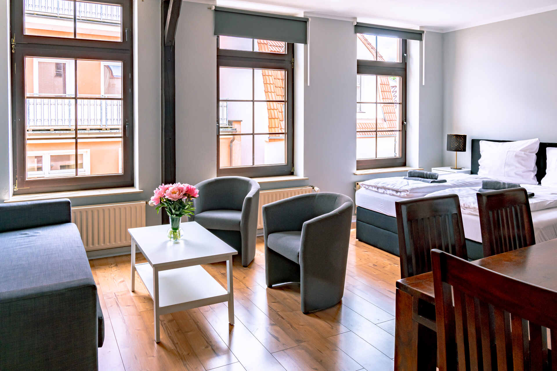 Auf 45 m² bietet das Apartment ausreichend Platz für bis zu 6 Gäste. Der helle Wohnbereich kombiniert Wohn- und Schlafraum und ist mit einem komfortablen Doppelbett sowie einer Schlafcouch ausgestattet – ideal für entspannte Abende oder zusätzliche Schlafplätze.