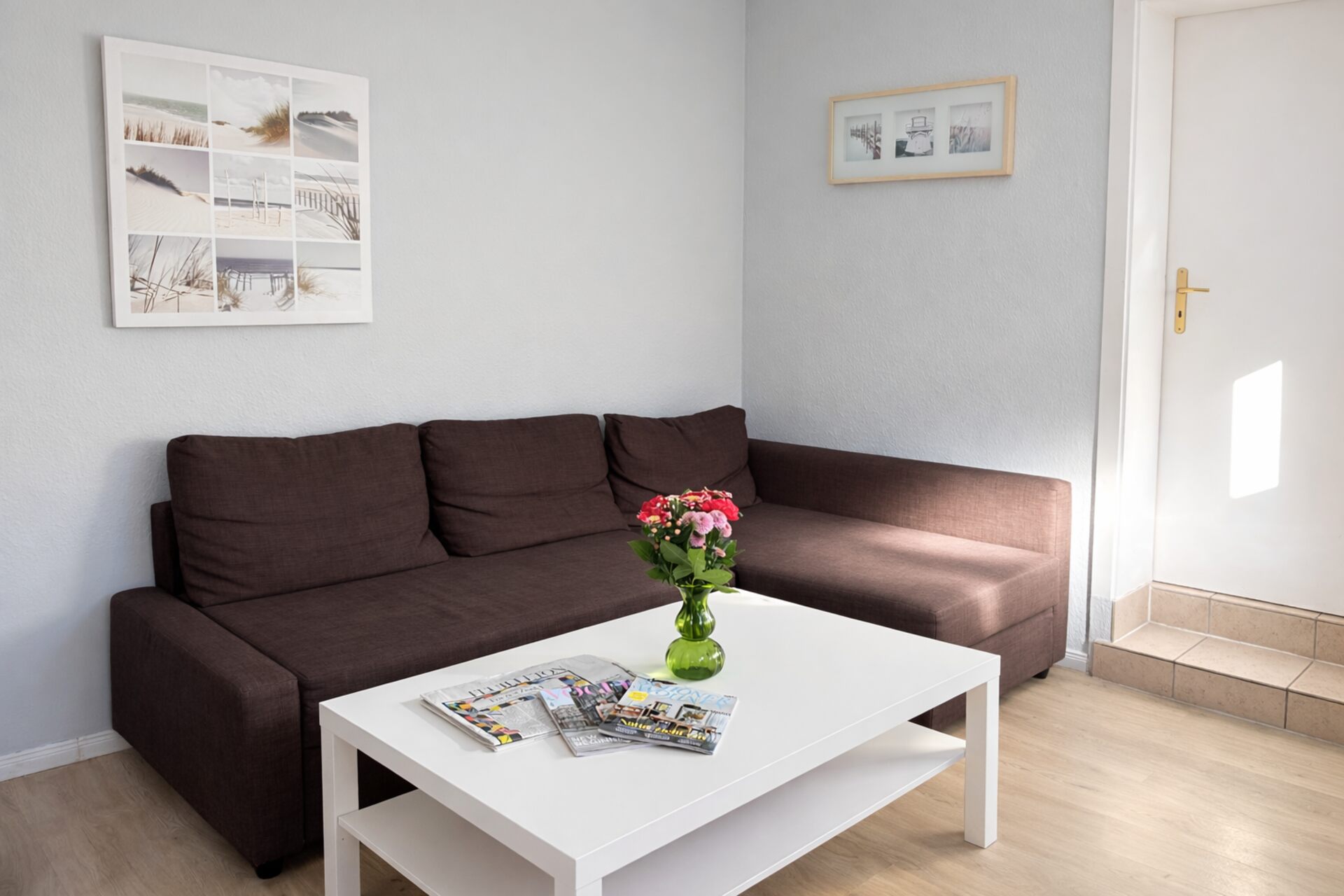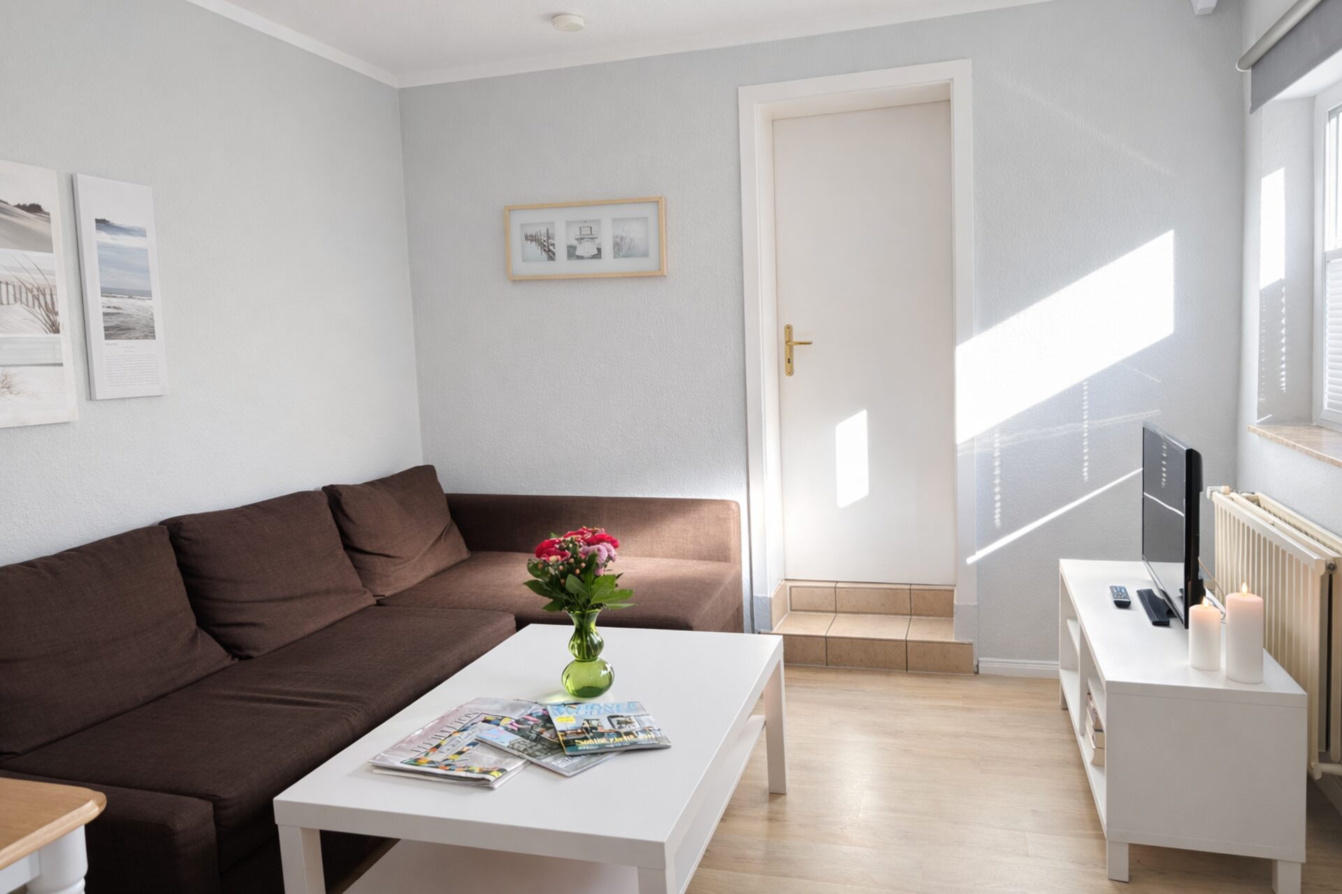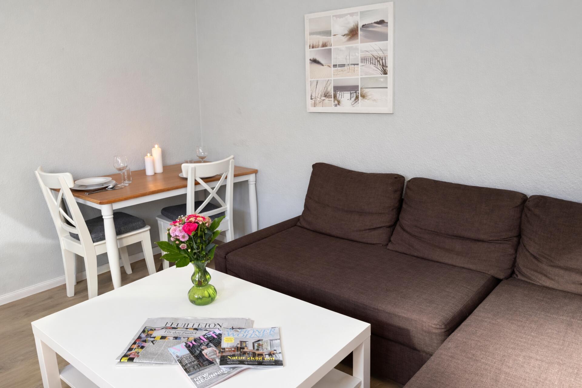 Im Wohnzimmer erwartet dich ein heller Wohnraum mit komfortabler Schlafcouch, Essbereich und Smart-TV – perfekt für entspannte Abende nach einem erlebnisreichen Tag am Strand.