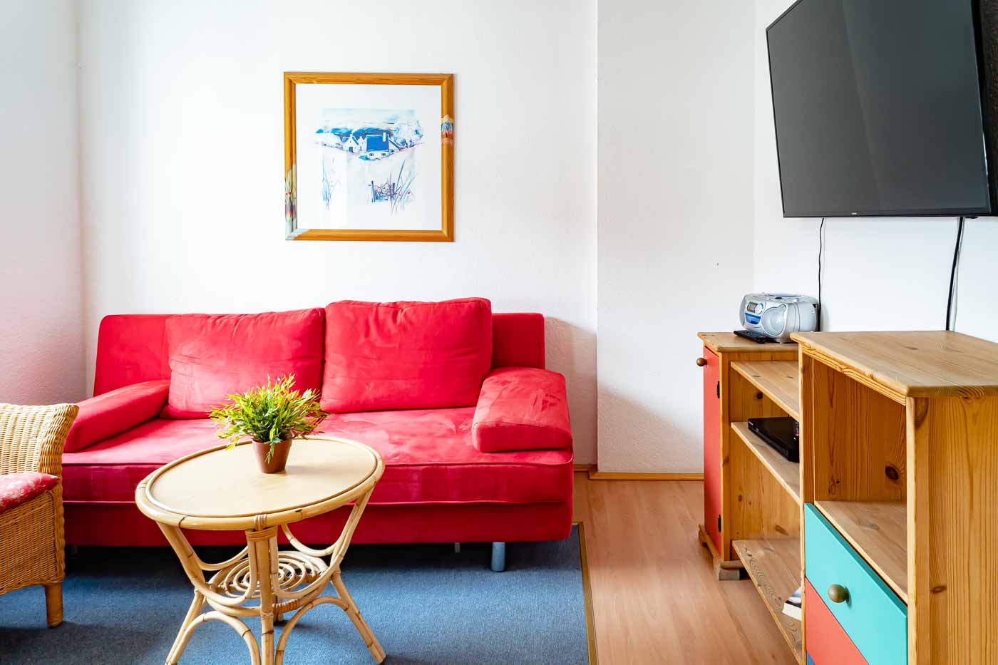 Das helle Wohnzimmer lädt nach einem Tag am Strand zum Entspannen ein.