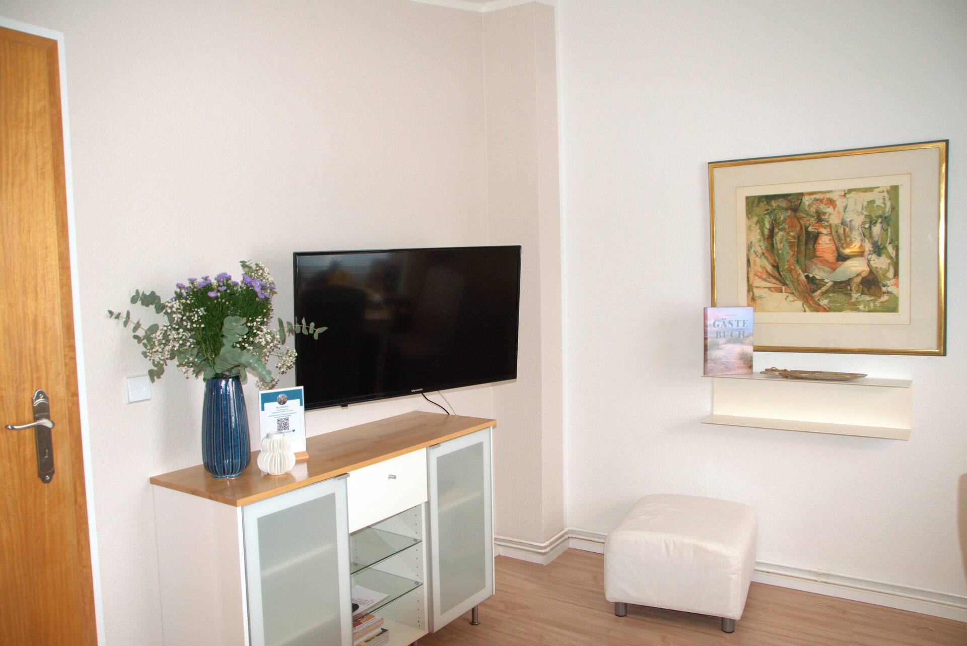 Der Wohnbereich lädt nach einem Tag am Meer zum Entspannen ein. Macht es euch auf der gemütlichen Couch bequem, schaut eure Lieblingsserie auf dem Smart-TV oder greift zu einem der bereitliegenden Bücher.