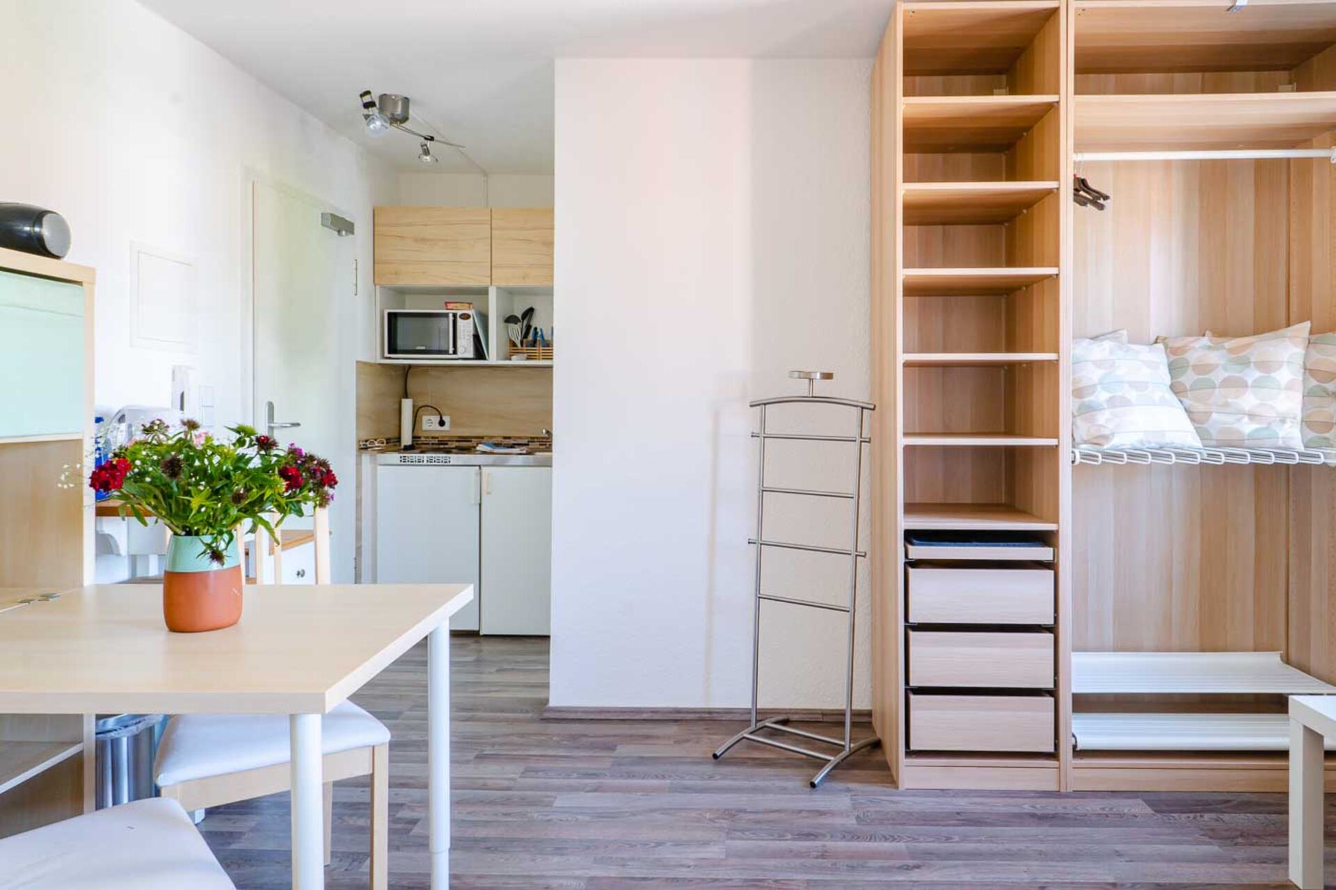 Auch für kleine Mahlzeiten bist du bestens ausgestattet: Die kompakte Küchenzeile bietet dir Kühlschrank, Kochfeld, Wasserkocher und Geschirr – perfekt für Frühstück, Snacks oder einen entspannten Tagesausklang.
